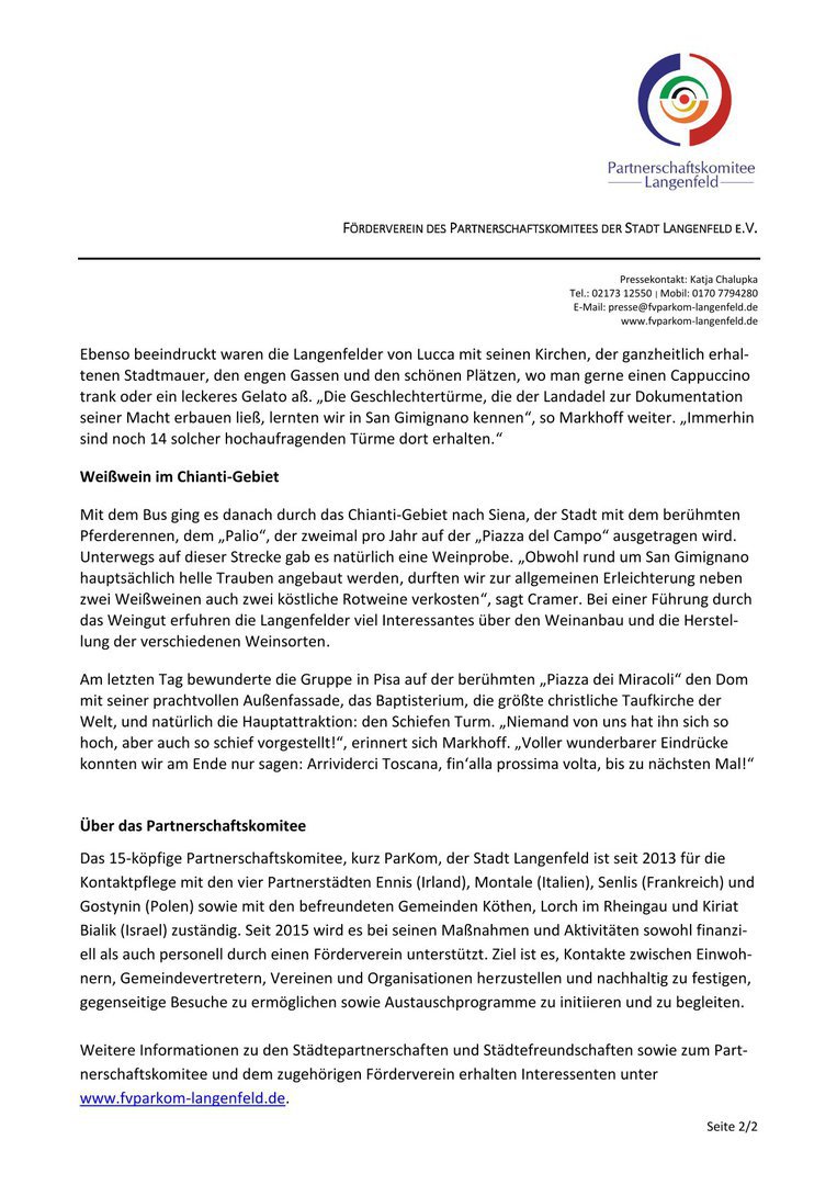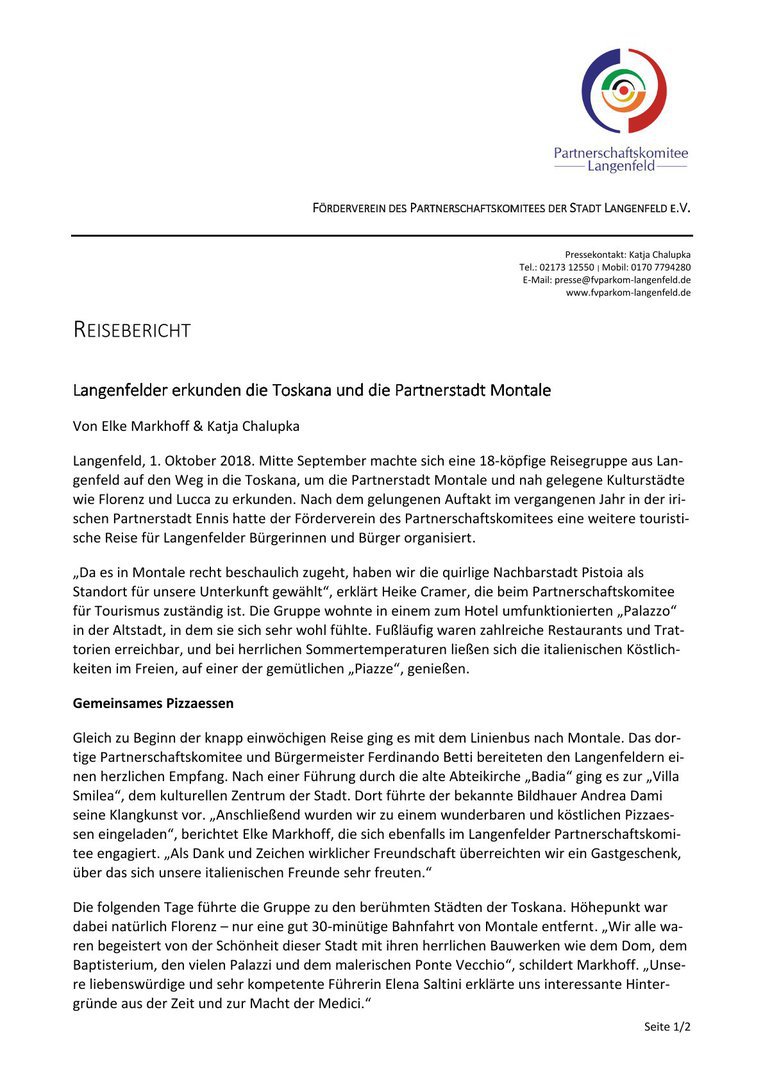 Mitte September 2018 machte sich eine 18-köpfige Reisegruppe aus Langenfeld auf den Weg in die Toskana, um die Partnerstadt Montale und nah gelegene Kulturstädte wie Florenz und Lucca zu erkunden. Nach dem gelungenen Auftakt im vergangenen Jahr in der irischen Partnerstadt Ennis hatte der Förderverein des Partnerschaftskomitees eine weitere touristische Reise für Langenfelder Bürgerinnen und Bürger organisiert.